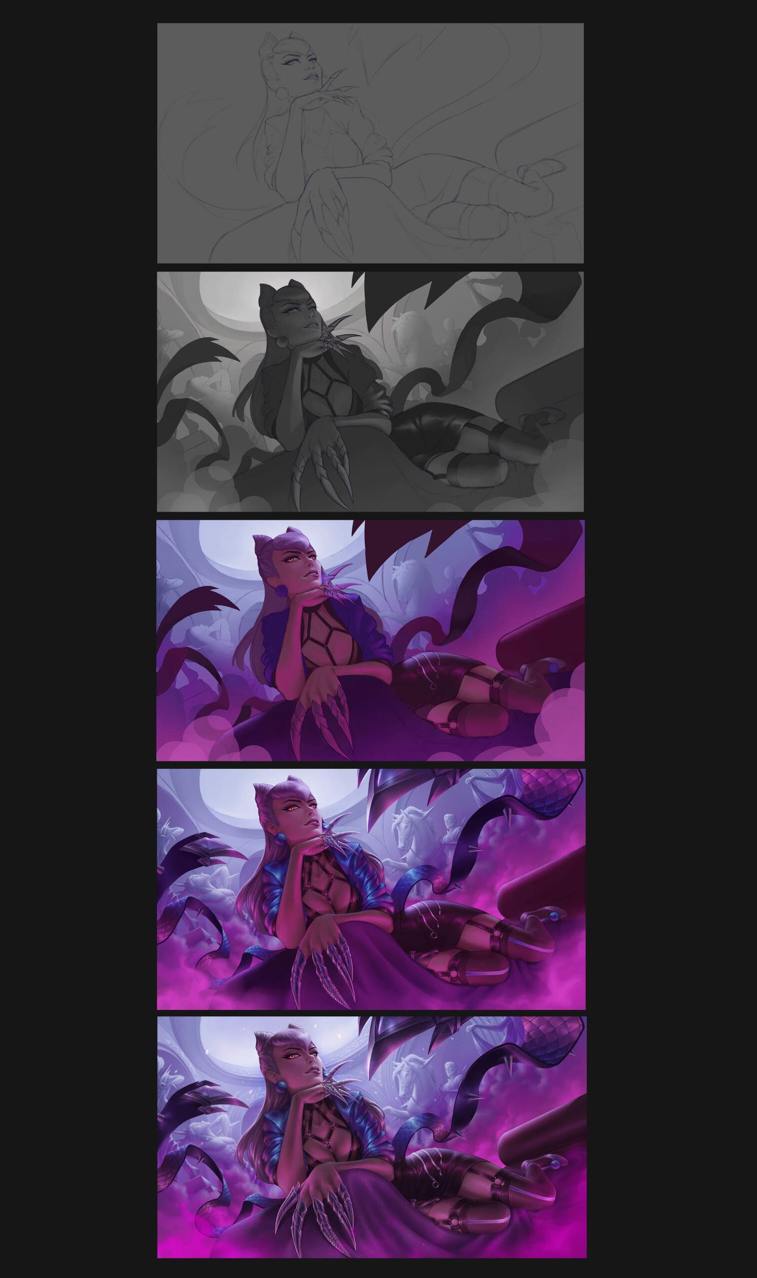 This fan art is inspired by the K/DA ALL OUT Evelynn splash art and the VILLAIN music video.